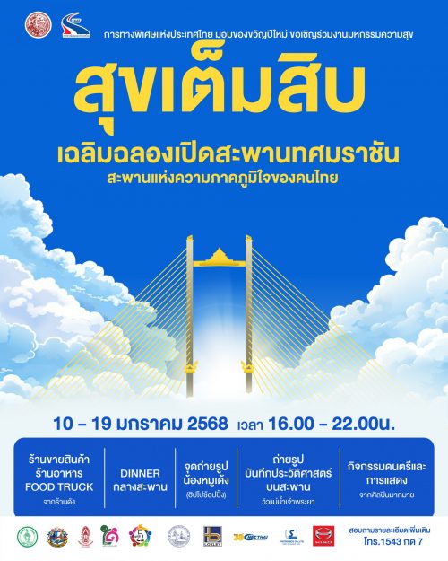 งานนี้ถือเป็นโอกาสครั้งสำคัญที่ประชาชนจะได้สัมผัสสะพานแห่งความภาคภูมิใจในมุมที่ไม่เคยเห็นมาก่อน ขอเชิญชวนคนไทยและผู้สนใจร่วมเดิน วิ่ง และบันทึกความทรงจำที่สะพานทศมราชัน พร้อมสร้างความสุขและพลังแห่งความสามัคคีในงาน “มหกรรมสุขเต็มสิบ” ไม่เพียงเท่านั้น งานนี้ยังเป็นการเฉลิมฉลองความยิ่งใหญ่ของสะพานทศมราชัน ที่สะท้อนถึงความภาคภูมิใจและการพัฒนาของประเทศไทย เชิญชวนทุกคนมาร่วมเป็นส่วนหนึ่งในประวัติศาสตร์ครั้งนี้ และสร้างความทรงจำอันทรงคุณค่าร่วมกัน สอบถามรายละเอียดเพิ่มเติมและสมัครร่วมกิจกรรมเดิน-วิ่ง ได้ที่ : www.thai.run<http://www.thai.run> Facebook : https://www.facebook.com/ExpresswayThailand และ EXAT Call Center โทร. 1543 กด 7