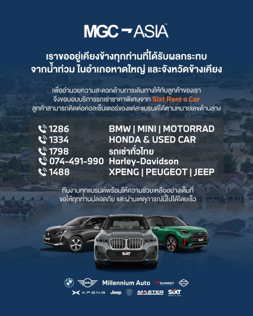 มหาอุทกภัยหาดใหญ่สร้างความเสียหายทั้งชีวิตและทรัพย์สิน หลังสถานการณ์คลี่คลาย ต้องเร่ง ฟื้นฟูพร้อมเยียวยาพี่น้องประชาชนที่ได้รับผลกระทบ เอ็มจีซี–เอเชีย ออโต้เพล็กซ์ หาดใหญ่ ภายใต้บริษัท มิลเลนเนียม กรุ๊ป คอร์ปอเรชั่น (เอเชีย) จำกัด (มหาชน) หรือ MGC-ASIA ร่วมส่งกำลังใจและความช่วยเหลือ ผ่านแคมเปญ ‘อยู่ที่ไหนจะไปหา’ จัดบริการรถยกฉุกเฉินฟรี สำหรับลูกค้า พร้อมดูแลรักษาตามมาตรฐาน รวมถึงบริการรถเช่า SIXT ในราคาพิเศษ