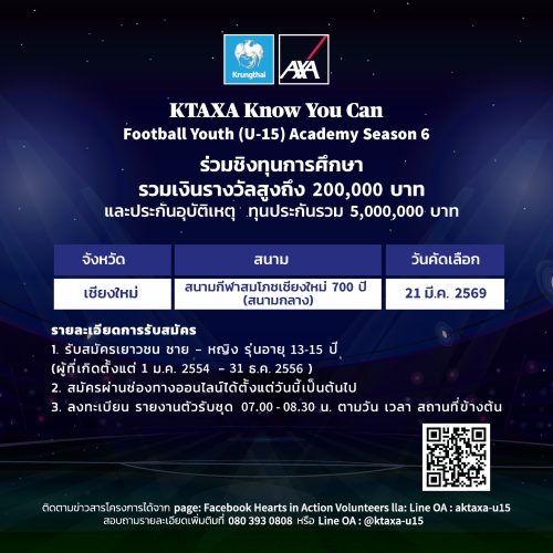 บมจ.กรุงไทย-แอกซ่า ประกันชีวิต เปิดรับสมัครเยาวชนภาคเหนือ เข้าร่วมโครงการ KTAXA Know You Can Football Youth (U-15) Academy Season 6 เพื่อชิงทุนการศึกษามูลค่าสูงถึง 200,000 บาท และประกันอุบัติเหตุ ทุนประกันรวมกว่า 5,000,000 บาท ซึ่งเปิดโอกาสให้เยาวชนอายุระหว่าง 13-15 ปี เข้าร่วมฝึกทักษะฟุตบอลตามมาตรฐานสากลจากโค้ชระดับ AFC – A – License ทั้งนี้โครงการดังกล่าว เป็นอีกหนึ่งในโครงการที่ยกระดับทักษะนักฟุตบอลเยาวชนของไทยสู่มาตรฐานระดับโลก และสร้างความตระหนักรู้ถึงความสำคัญของการมีสุขภาพที่ดีผ่านการออกกำลังกาย อีกทั้งยังสอดคล้องกับการเป็นพันธมิตรหลักอย่างเป็นทางการของสโมสรฟุตบอลลิเวอร์พูล และร่วมสร้างพลังกายพลังใจ ความเชื่อมั่นในตนเอง ว่าทุกคนทำได้ “Know You Can”