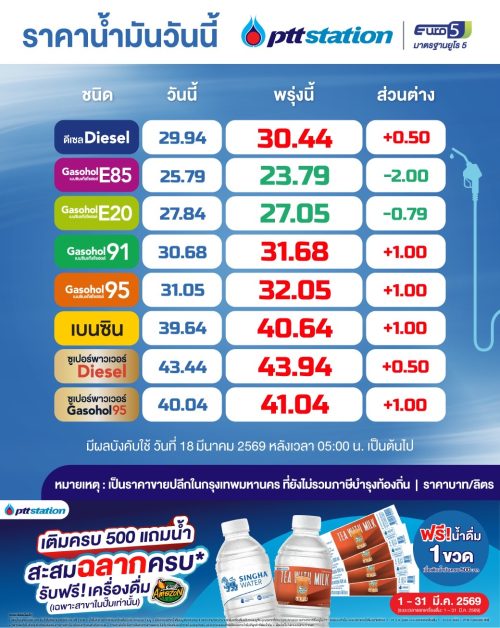 โดยกลุ่มดีเซลปรับเพิ่มขึ้น 0.50 บาทต่อลิตร ส่วนกลุ่มเบนซินและแก๊สโซฮอล์ทุกชนิดปรับเพิ่มขึ้น 1.00 บาทต่อลิตร ยกเว้น E20 ปรับลดลง 0.79 บาทต่อลิตร และ E85 ปรับลดลง 2.00 บาทต่อลิตร มีผลตั้งแต่วันที่ 18 มีนาคม 2569 เวลา 05.00 น. เป็นต้นไป โดยราคาขายปลีกจะเป็น ดังนี้ ULG = 40.64 บาท/ลิตร, GSH95 = 32.05 บาท/ลิตร, E20 = 27.05 บาท/ลิตร, E85 = 23.79 บาท/ลิตร, GSH91 = 31.68 บาท/ลิตร, พรีเมี่ยม GSH95 = 41.04 บาท/ลิตร, HSD = 30.44 บาท/ลิตร และพรีเมียมดีเซล = 43.94 บาท/ลิตร (ราคาขายปลีกข้างต้นยังไม่รวมภาษีบำรุงกรุงเทพมหานคร)
