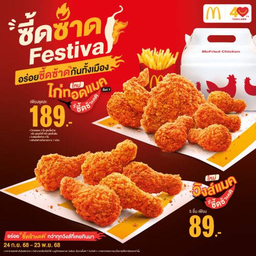 มาอร่อยซี้ดซ้าดกันทั้งเมือง! กับ ‘วิงส์แมคซี้ดซ้าด’ 2 ชิ้น เริ่มต้นเพียง 39 บาท และ 5 ชิ้น เริ่มต้นเพียง 89 บาท พิเศษ! สำหรับเแฟนไก่ทอดแมค กับ ‘ชุดไก่ทอดแมคซี้ดซ้าด’ (ชุด 1) การรวมตัวของความอร่อยจากไก่ทอดแมคสูตรซี้ดซ้าด 2ชิ้น และวิงส์แมคซี้ดซ้าด 4 ชิ้น พร้อมเฟรนช์ฟรายส์ขนาดกลาง ราคาเริ่มต้นเพียง 189 บาทได้แล้วตั้งแต่วันนี้ถึง 23 พฤศจิกายน 2568 ที่ร้านแมคโดนัลด์ทุกสาขาที่ร่วมรายการ,แมคไดร์ฟ ทรู และแมคดิลิเวอรี โทร.1711, เว็บไซต์ www.mcdonalds.co.th ติดตามรายละเอียดเพิ่มเติมได้ที่ Facebook.com/McThai