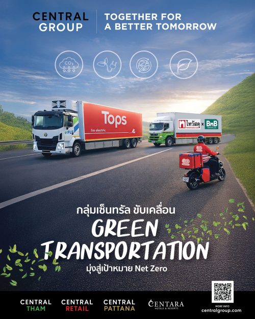 จากแนวคิดดังกล่าว กลุ่มเซ็นทรัลจึงกำหนดให้การขับเคลื่อน Green Transportation เป็นหนึ่งในกลยุทธ์สำคัญขององค์กร ผ่านการส่งเสริมนวัตกรรม การใช้พลังงานสะอาด เทคโนโลยีที่เป็นมิตรและรับผิดชอบต่อสิ่งแวดล้อม รวมถึงการนำนวัตกรรมด้านข้อมูล (Data) และเทคโนโลยีอัจฉริยะมาใช้ในการบริหารจัดการระบบขนส่งและโลจิสติกส์ เพื่อเพิ่มประสิทธิภาพ ลดการสูญเสีย และลดการปล่อยก๊าซเรือนกระจกอย่างเป็นรูปธรรม สนับสนุนการเปลี่ยนผ่านสู่เศรษฐกิจคาร์บอนต่ำ และเป้าหมายการปล่อยก๊าซเรือนกระจกสุทธิเป็นศูนย์ (Net Zero) ภายในปี 2050