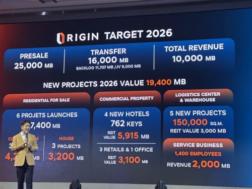 ภายใต้การพัฒนา โครงการคอนโดมิเนียมของ บริษัท ออริจิ้น เวอร์ติเคิล คอร์ปอเรชั่น จำกัด หรือ ORIGIN VERTICAL ปี 2026 มีแผนเปิดตัวโครงการใหม่ 3 โครงการ ทำเลกรุงเทพฯ พัทยา และภูเก็ต มูลค่ารวม 4,200 ล้านบาท ตั้งเป้ายอดขาย 20,000 ล้านบาท รายได้ 4,500 ล้านบาท และยอดโอนกรรมสิทธิ์ 12,000 ล้านบาท (รวมโครงการที่บริษัทฯพัฒนา และโครงการร่วมทุน) ปัจจุบัน มี Backlog จากโครงการคอนโดมิเนียมที่แล้วเสร็จใหม่ ที่พร้อมโอนกรรมสิทธิ์ให้กับลูกค้าในปี 2026 รวมมูลค่ากว่า 10,000 ล้านบาท คิดเป็น 70% ของมูลค่าโครงการรวมจาก 7 โครงการ