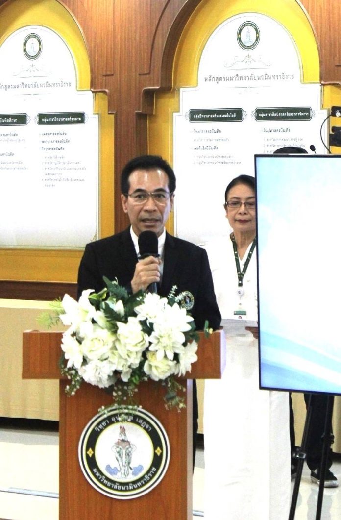 รศ.พงษ์ศักดิ์ น้อยพยัคฆ์ รักษาการแทนอธิการบดีกล่าวว่า งานวันสถาปนาฯ ในปีนี้ ถือเป็นโอกาสสำคัญในการตอกย้ำวิสัยทัศน์ของมหาวิทยาลัยในการพัฒนาองค์กรและบุคลากรเพื่อเป็นเสาหลักในการขับเคลื่อนและยกระดับคุณภาพชีวิตของคนเมืองอย่างยั่งยืน โดยมหาวิทยาลัยนวมินทราธิราช ได้ดำเนินงานสืบเนื่องมาจนถึงปัจจุบันเป็นระยะเวลา 15 ปี จากวิสัยทัศน์ของมหาวิทยาลัยที่มุ่งสู่การเป็น“ผู้นำแห่งศาสตร์เพื่อการพัฒนาเมืองและคุณภาพชีวิตของคนเมือง” สภามหาวิทยาลัยมีบทบาทสำคัญในการกำหนดทิศทางนโยบายและมาตรฐานการดำเนินงาน เพื่อให้มหาวิทยาลัยพัฒนาไปอย่างมีประสิทธิภาพ โปร่งใสและบรรลุเป้าหมายตามวิสัยทัศน์ที่กำหนดไว้ทั้งในเชิงนโยบาย การกับดูแล สนับสนุน ส่งเสริมและประเมินผล ซึ่งส่งผลให้มหาวิทยาลัยมีการพัฒนาอย่างเป็นรูปธรรมในด้านต่าง ๆ อย่างต่อเนื่อง อาทิ ด้านการศึกษา มหาวิทยาลัยมุ่งพัฒนาและยกระดับคุณภาพหลักสูตรให้ได้มาตรฐานสากล พัฒนาการเรียนรู้ระบบ Micro – Credential เพื่อรองรับความต้องการของเมือง รวมถึงเสริมสร้างศักยภาพอาจารย์เพื่อสนับสนุนการเรียนรู้ให้มีคุณภาพโดยสนับสนุนให้เข้ารับการประเมินสมรรถนะอาจารย์ด้านการเรียนการสอน (ThailandPSFหรือ UK PSF) และการเข้าสู่ตำแหน่งทางวิชาการที่สูงขึ้น