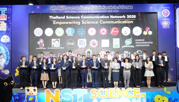 14 สิงหาคม 2568 / ศ.ดร.ศุภชัย ปทุมนากุล ปลัดกระทรวงการอุดมศึกษา วิทยาศาสตร์ วิจัยและนวัตกรรม (อว.) เป็นประธานในพิธีประกาศเจตจำนงค์ของเครือข่ายพลังสื่อสารวิทยาศาสตร์เครือข่ายระดับประเทศ ในงาน THAILAND SCIENCE COMMUNICATION AWARDS AND NETWORK 2025 โดยมี นายวิเชียร สุขสร้อย เลขานุการรัฐมนตรีว่าการกระทรวง อว.นายสุวรงค์ วงษ์ศิริ รักษาการแทนผู้อำนวยการองค์การพิพิธภัณฑ์วิทยาศาสตร์แห่งชาติ (อพวช.) หรือ NSM และผู้บริหารหน่วยงานเครือข่ายสื่อสารวิทยาศาสตร์ เข้าร่วม พร้อมมอบรางวัล Science Communication Award 2025 แก่บุคคลากรหรือองค์กรที่ขับเคลื่อนด้านสื่อสารวิทย์ฯ สู่สาธารณะได้อย่างโดดเด่น นับเป็นก้าวสำคัญที่สร้างรากฐานในการพัฒนาประเทศไทยให้ทัดเทียมไปสู่ระดับนานาชาติต่อไป ณ เวทีกลาง ชั้น LG ศูนย์การประชุมแห่งชาติสิริกิติ์ กรุงเทพฯ