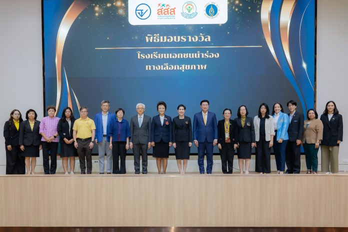 วันที่ 20 ตุลาคม 2568 ณ ห้องประชุมใหญ่ ชั้น 10 อาคาร OSSC สำนักงานคณะกรรมการอาหารและยา (อย.) เภสัชกรหญิงสุภัทรา บุญเสริม เลขาธิการ อย. เป็นประธานมอบโล่รางวัลและเกียรติบัตรแก่ 10 โรงเรียนเอกชน และสำนักงานสาธารณสุขจังหวัด ที่ร่วมขับเคลื่อนโครงการส่งเสริมการบริโภคอาหาร “ทางเลือกสุขภาพ” ภายใต้นโยบาย Healthier School Policy ที่มุ่งวางรากฐานสุขภาพที่ยั่งยืนให้กับเด็กไทย โดยสร้างสภาพแวดล้อมที่เอื้อต่อการบริโภคอาหารลดหวาน มัน เค็ม เลือกบริโภคอาหารที่มีคุณภาพ พร้อมผลักดันข้อเสนอเชิงนโยบายให้สามารถขยายผลในระดับประเทศต่อไป ผ่านความร่วมมือระหว่างภาครัฐ ภาควิชาการ และสถานศึกษา