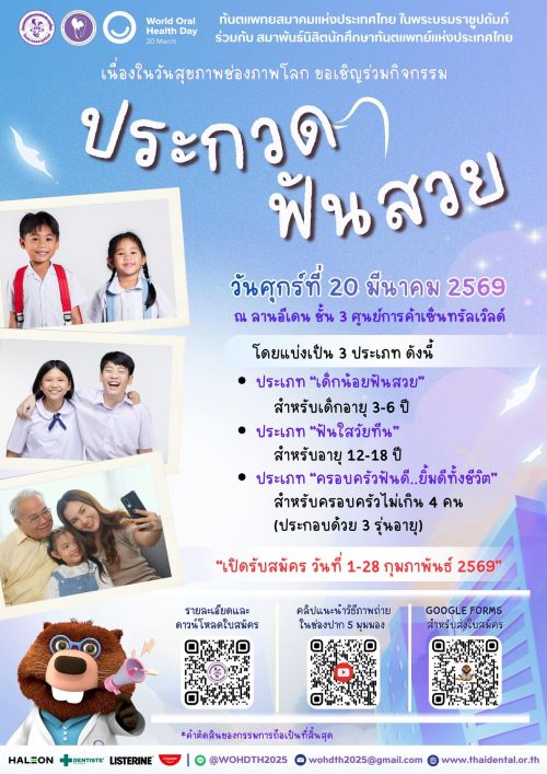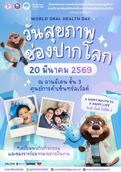 สำหรับผู้ที่สนใจกิจกรรมวันสุขภาพช่องปากโลก (World Oral Health Day) ของประเทศไทย พร้อมทั้งข่าวสารของทันตแพทยสมาคมแห่งประเทศไทยฯ สามารถติดตามได้ที่wohd2026.thaidental.or.th และ Facebook ทันตแพทยสมาคมแห่งประเทศไทยฯ