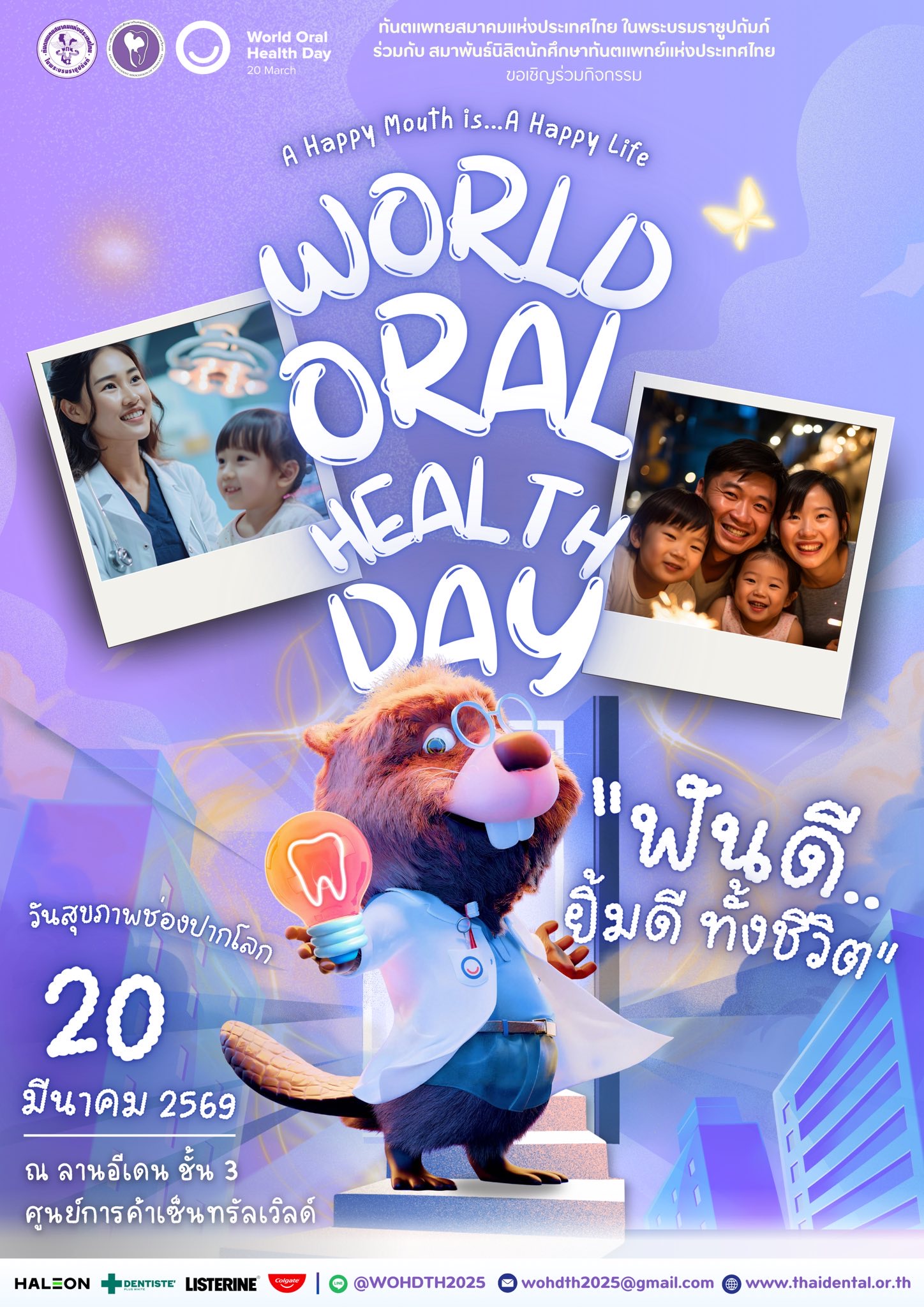 ณ ลาน Eden ชั้น 3 ศูนย์การค้าเซ็นทรัลเวิลด์ มุ่งเน้นการสร้างความเข้าใจต่อการดูแลสุขภาพช่องปากตั้งแต่วัยเด็ก วัยรุ่น วัยทำงาน ไปจนถึงผู้สูงอายุ เป็นการลงทุนด้านสุขภาพระยะยาวที่สำคัญ ซึ่งจะช่วยลดภาระโรค เพิ่มคุณภาพชีวิต และส่งเสริมความสุขในครอบครัวและสังคมโดยรวม