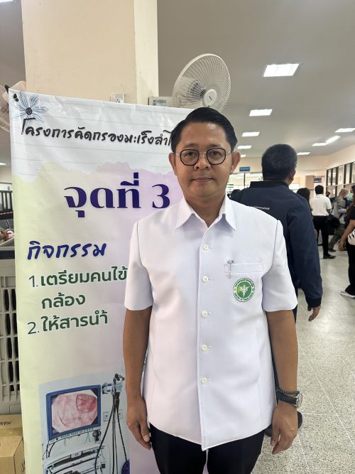 ด้านนางบุญทัน ยุพยงค์ อายุ 61 ปี ที่ได้รับการตรวจคัดกรองมะเร็งลำไส้และพบว่าผลเป็นบวก เล่าว่า วันนี้ตนมาทำการส่องกล้อง หลังจากที่ อสม.ได้ให้ตนตรวจคัดกรองเพราะว่าอยู่ในกลุ่มเสี่ยงแล้วพบว่าอุจาระมีเลือดปน ผลเป็นบวก จึงได้นัดคิวให้มาส่องกล้องเพื่อตรวจดูว่ามีติ่งเนื้ออยู่ในลำไส้ คุณหมอได้ตัดชิ้นเนื้อไปตรวจและนัดมาฟังผลอีกครั้งในวันที่ 7เม.ย. 69 ซึ่งคุณหมอบอกว่าอาจจะเป็นติ่งเนื้อธรรมดาก็ได้ ไม่เจ็บ และสามารถกลับบ้านได้เลย ตนอยากเชิญชวนให้ผู้ที่อยู่ในกลุ่มเสี่ยงเหมือนตนมาตรวจกันมากๆจะได้รู้ การที่ตนมาตรวจเพราะว่าคนแถวหมู่บ้านเป็นมะเร็งกันมาก ทั้งตับ ปอด ตายไปแล้วก็หลายคน พอมีโอกาสก็เลยมาตรวจ ตนต้องขอขอบคุณทุกหน่วยงานที่ให้โอกาสตนได้มาตรวจ เพราะอยากบอกว่าไม่เจ็บเลย ตรวจเสร็จก็กลับบ้านได้