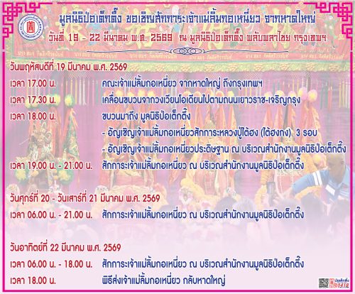 ระหว่างวันที่ 19 – 22 มีนาคม พ.ศ. 2569 มูลนิธิป่อเต็กตึ๊ง ร่วมกับมูลนิธิมิตรภาพสามัคคี (ท่งเซียเซี่ยงตึ๊ง) หาดใหญ่ ขอเชิญศิษยานุศิษย์ และสาธุชนที่เลื่อมใส ร่วมสักการะองค์เจ้าแม่ลิ้มกอเหนี่ยวจากหาดใหญ่ องค์หลวงปู่ไต้ฮงโจวซือ องค์ฮกเต็กแป๊ะกง และองค์นาจาไท้จื้อ (เทพโกมินทร์) ณ บริเวณลานสำนักงาน มูลนิธิป่อเต็กตึ๊ง พลับพลาไชย กรุงเทพฯ โดยในวันพฤหัสบดีที่ 19 มีนาคม พ.ศ. 2569 เวลาประมาณ 17.00 น. คณะเจ้าแม่ลิ้มกอเหนี่ยวเดินทางถึงกรุงเทพฯ เคลื่อนขบวนผ่านบริเวณวงเวียนโอเดียน ไปตามถนนเยาวราช เจริญกรุง โดยขบวนจะแห่ถึงมูลนิธิป่อเต็กตึ๊ง และเปิดให้ผู้มีจิตศรัทธาเข้าสักการะ เวลาประมาณ 18.00 น. และในวันศุกร์ที่ 20 มีนาคม – วันเสาร์ที่ 21 มีนาคม พ.ศ. 2569 มูลนิธิป่อเต็กตึ๊งเปิดให้ผู้มีจิตศรัทธาเข้าสักการะตั้งแต่เวลา 06.00 – 21.00 น. สำหรับวันอาทิตย์ที่ 22 มีนาคม พ.ศ. 2569 เวลาประมาณ 18.00 น. จะมีพิธีส่งเจ้าแม่ลิ้มกอเหนี่ยวกลับหาดใหญ่