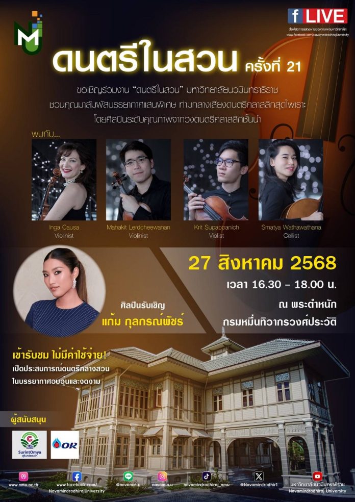 นวมินทราธิราช ขอเชิญผู้มีใจรักในเสียงดนตรี มาร่วมดื่มด่ำกับสุนทรียภาพแห่งบทเพลง ท่ามกลางบรรยากาศอันแสนอบอุ่น ในวันพุธที่ 27 สิงหาคม 2568 เวลา 16.30-18.00 น. ณ พระตำหนักกรมหมื่นทิวากรวงศ์ประวัติ สัมผัสบรรยากาศแสนพิเศษ ท่ามกลางเสียงดนตรีคลาสสิกสุดไพเราะโดยศิลปินระดับคุณภาพชั้นนำ เช่น แก้ม -กุลกรพัชร์ (แก้ม กุลกรณ์พัชร์ เมอร์นาร์ด) นักร้องและนักแสดงมิวสิคัลแถวหน้าของวงการ, Inga Causa
