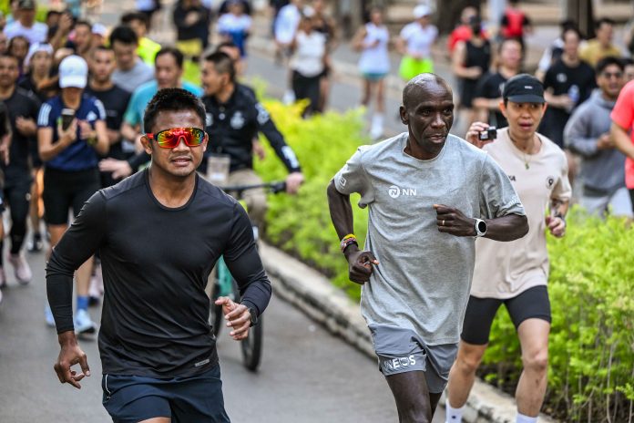 กรุงเทพฯ — วันที่ ๒๙ พฤศจิกายน ๒๕๖๘ เอเลียด คิปโชเก้ (Eliud Kipchoge) ตำนานนักวิ่งมาราธอนชาวเคนยา เจ้าของสถิติโลกและเหรียญทองโอลิมปิก ออกมาซ้อมวิ่งเพื่อเตรียมตัวลงวิ่งมาราธอนในเมืองหลวง (World Capital Marathon Series) ครั้งที่ ๘ ประจำปี ๒๕๖๘ รายการ “AMAZING THAILAND MARATHON BANGKOK 2025 Presented by TOYOTA ชิงถ้วยพระราชทานจากพระบาทสมเด็จพระเจ้าอยู่หัว และสมเด็จพระนางเจ้าฯ พระบรมราชินี Amazing Thailand Marathon Bangkok 2025 โดยมี ร.อ.สมบัติ บัญชาเมฆ หรือ บัวขาว นักมวยระดับตำนานของไทย มาร่วมสร้างสีสัน ท่ามกลางบรรยากาศที่เป็นกันเองที่สวนลุมพินี