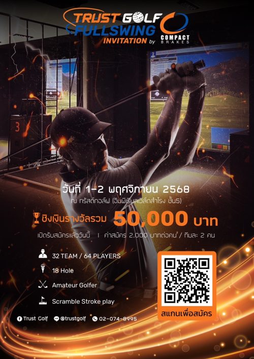 การแข่งขัน ทรัสต์กอล์ฟ ฟูลสวิง อินวิเตชั่น บาย คอมแพ็คส์ เบรคส์” ครั้งที่ 1 เปิดรับสมัครเฉพาะนักกีฬากอล์ฟสมัครเล่นและนักกอล์ฟเยาวชน ที่มุ่งหวังถึงความท้าทาย ต้องการพัฒนาทักษะการเล่นกอล์ฟในประสบการณ์ใหม่ๆ ผ่านการแข่งขันในสนามกอล์ฟจำลองของเทคโนโลยีระบบ Fullswing Simulator เครื่องจำรองสนามที่ให้ความสวยงามและท้าทายความสามารถของแต่ละคน ในการเล่นทุกช็อตเกมส์ได้อย่างท้าทายที่สมจริงที่สุดในโลก กำหนดแข่งขันวันที่ 1-2 พฤศจิกายน 2568 ณ ทรัสต์กอล์ฟ ศูนย์ฝึกกีฬากอล์ฟ ตั้งอยู่ชั้น 5 ห้างอิมพีเรียลเวิลด์ สำโรง