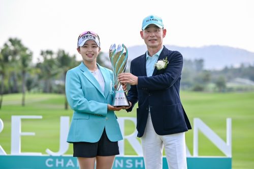 (ขวา) จอง ซัง ซู ประธานบริหาร บริษัท รีจูรัน จำกัด ผู้สนับสนุนหลักอย่างเป็นทางการร่วมแสดงความยินดีกับ ลิม จินยอง แชมป์รายการแข่งขัน รีจูรัน แชมเปี้ยนชิพ 2026 ชิงเงินรางวัลรวม 1,200 ล้านวอน ราว 22.44 ล้านบาท ที่สนาม อมตะ สปริง คันทรี คลับ ระยะเล่น 6,552 หลา แบบพาร์ 72 จบรอบวันสุดท้ายเมื่อวันอาทิตย์ที่ 15 มีนาคม 2569